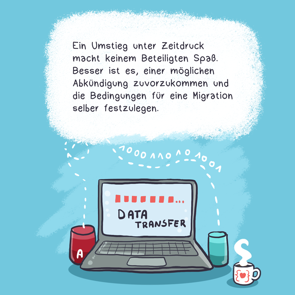 Ein Umstieg unter Zeitdruck, weil die Abkündigung nur ein paar Monate Zeit lässt, macht keinem Beteiligten Spaß. Besser ist es, die Bedingungen für eine Migration von Daten und Prozessen auf eine andere Technologie selber festzulegen.