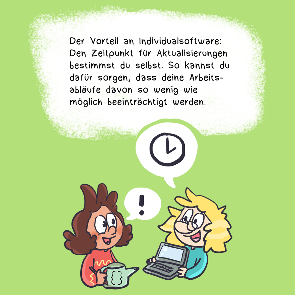 Während Sie das aktuelle Windows-Update nehmen müssen, wie und vor allem wann es kommt - im Zweifel auch genau dann, wenn es Ihnen gerade gar nicht in den Kram passt -, können Sie den Zeitpunkt für Aktualisierungen der von Ihnen oder für Sie entwickelten Individualsoftware selbst bestimmen. Und natürlich lassen die sich so planen, dass Ihre Arbeitsabläufe davon so wenig wie möglich beeinträchtigt werden.